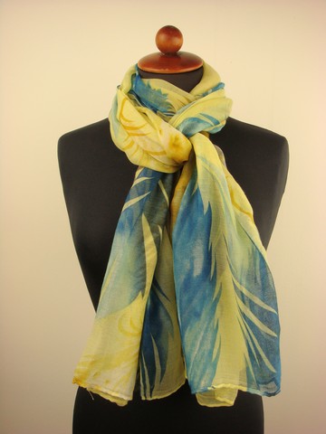 Deze dames zomersjaal grote veer is een mooi sjaaltje voor de zonnige dagen. De sjaal is onder andere geel van kleur. Hij is 75 cm breed en 180 cm lang. Het is een lekker dun sjaaltje van 100% viscose.