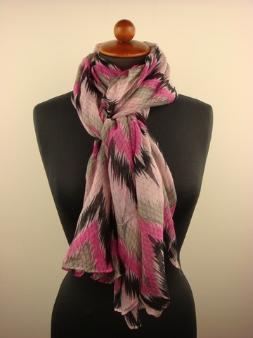 Deze sjaal is fuchsia met roze, grijs en zwart van kleur .