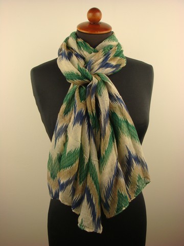 - Deze sjaal is groen met beige en donkerblauw van kleur .