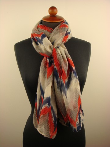 Deze sjaal is oranje met marineblauw en grijs van kleur .