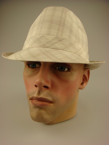 Deze heren zomer hoed heeft de rand van de hoed aan de voorkant omlaag en aan de achterkant omhoog.